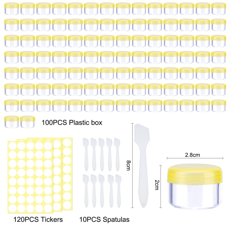 100 Pieces 5ml /5 Gram Empty Containers Mini Clear Jar Sample Transparent Cream Cosmetic Bottle Containers with 10 Pieces Mini Spatulas,Label(yellow)