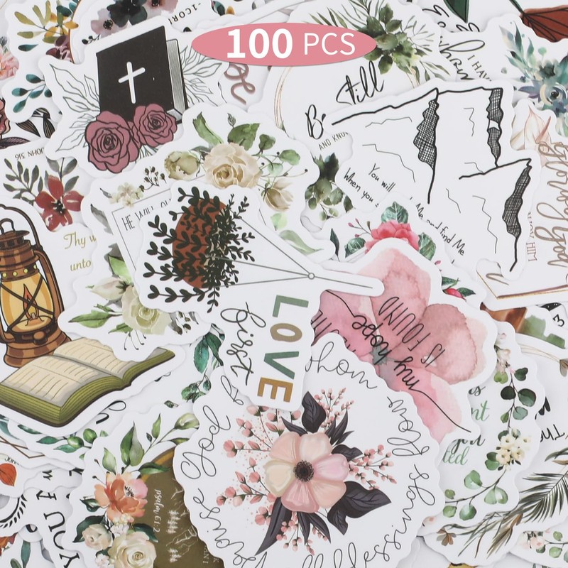 - Package Content Each set contains a variety of Bible verse stickers. The sizes of the 100 stickers range between 5 and 6 cm and have unique designs that inspire and uplift.