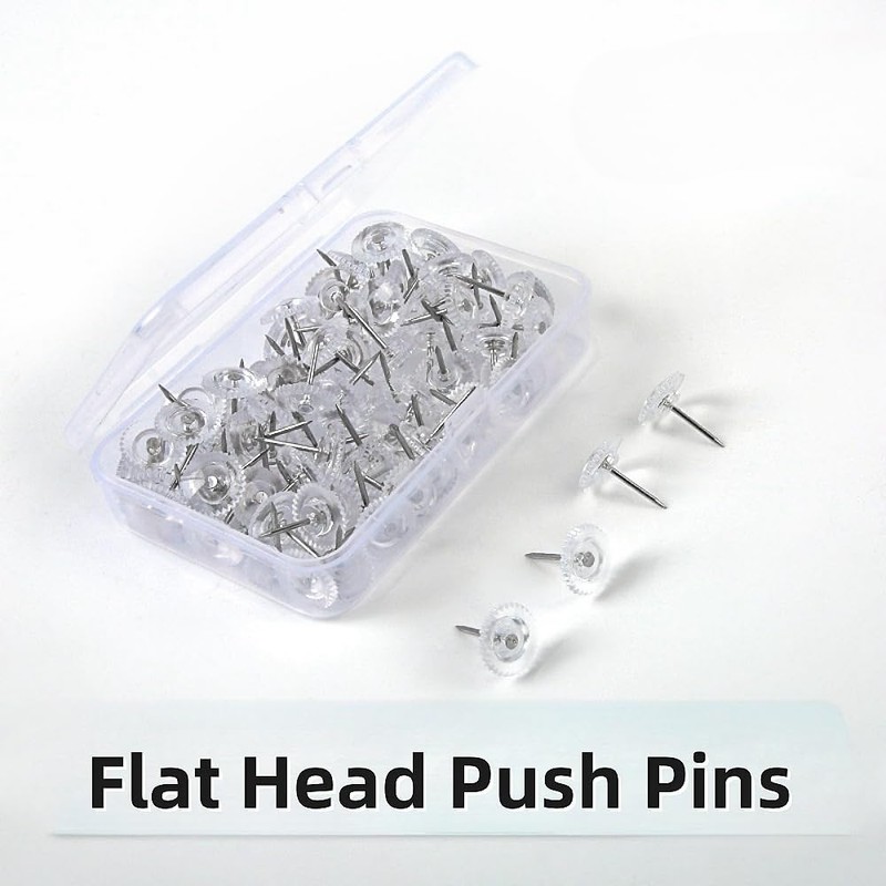 - Package Includes: The package contains 100 clear flat thumbtacks and a clear plastic box for easy transportation and storage. There are enough transparent push pins to meet your daily needs for pasting paper, pictures, etc