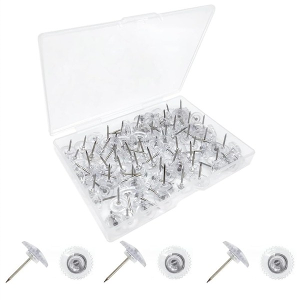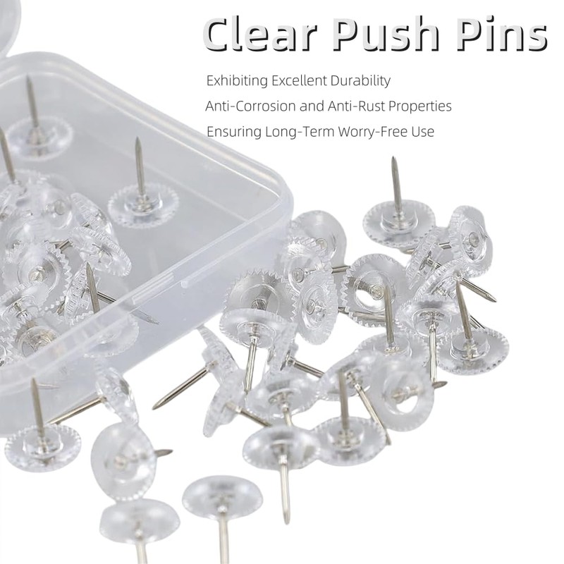 - Package Includes: The package contains 100 clear flat thumbtacks and a clear plastic box for easy transportation and storage. There are enough transparent push pins to meet your daily needs for pasting paper, pictures, etc