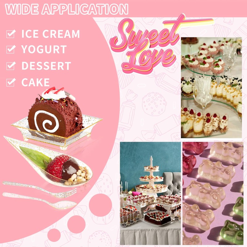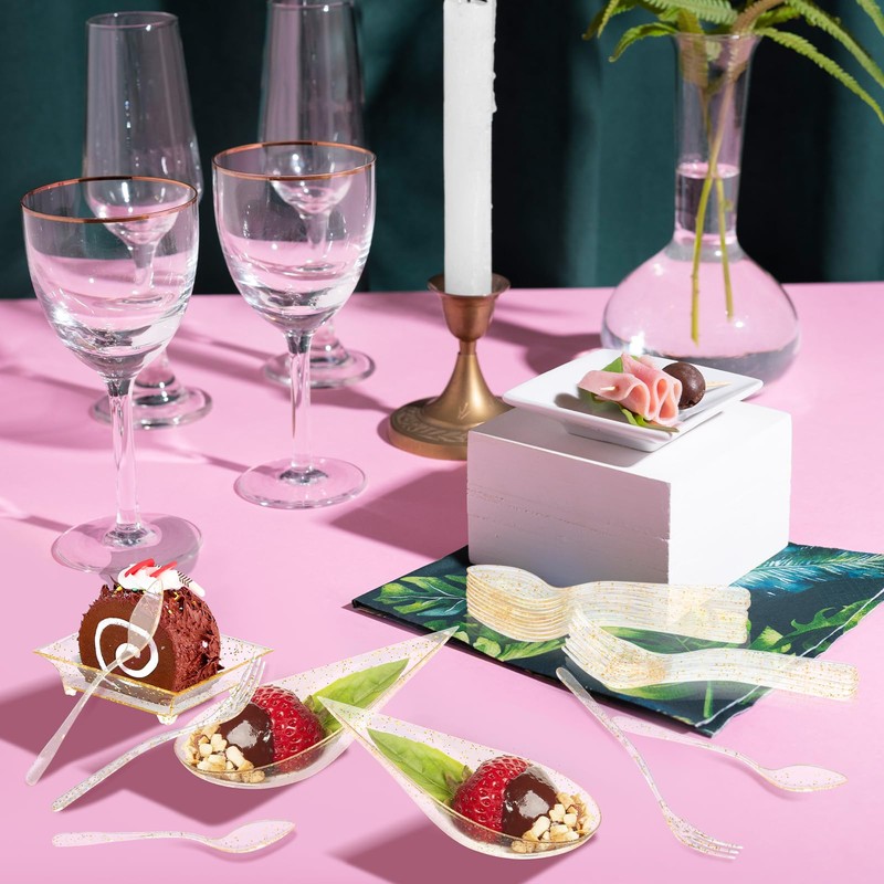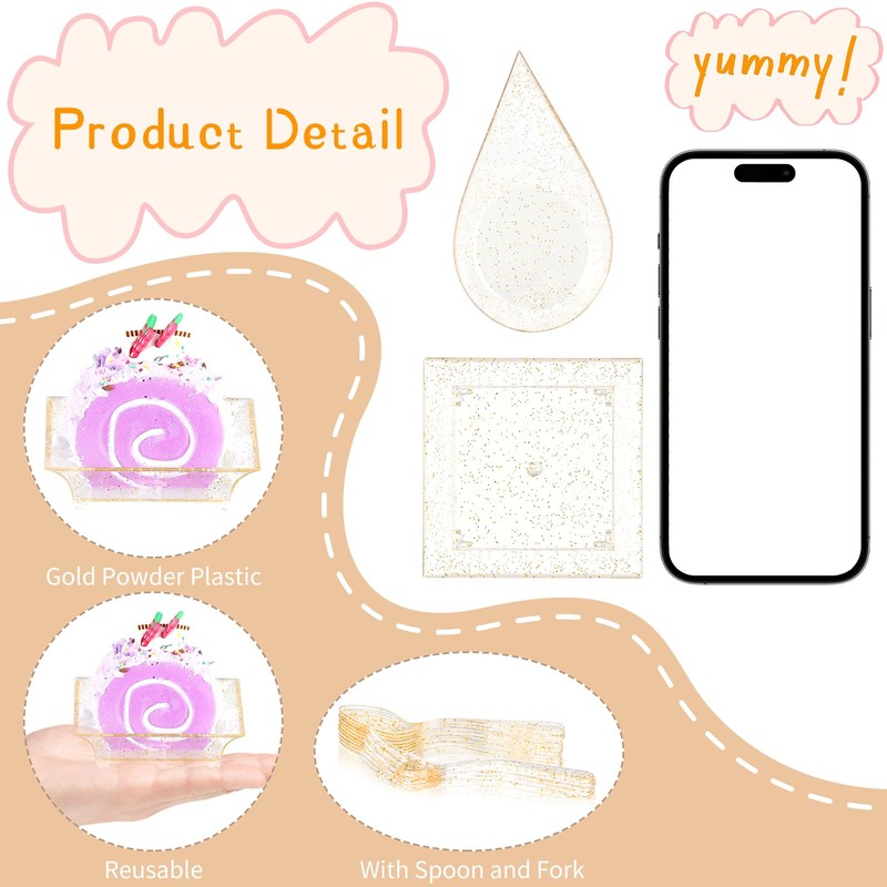 - Gold Glitter Design: The gold glitter design is perfect for your birthday party or party, it will match perfectly with any table and decorations at the party. Impress your guests with these Gold Mini Tasting Plates with Spoon and Fork. And they are not easy to break or deform.