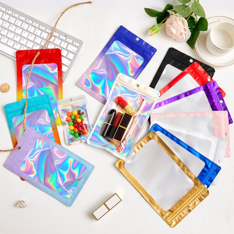 100 Pieces Purple Fade Blue Resealable Mylar Holographic Bags Food Storage Smell Proof Bags with Front Window Packaging Pouch for Cookies Sample Jewelry Snack,3.54 * 6.31 inches