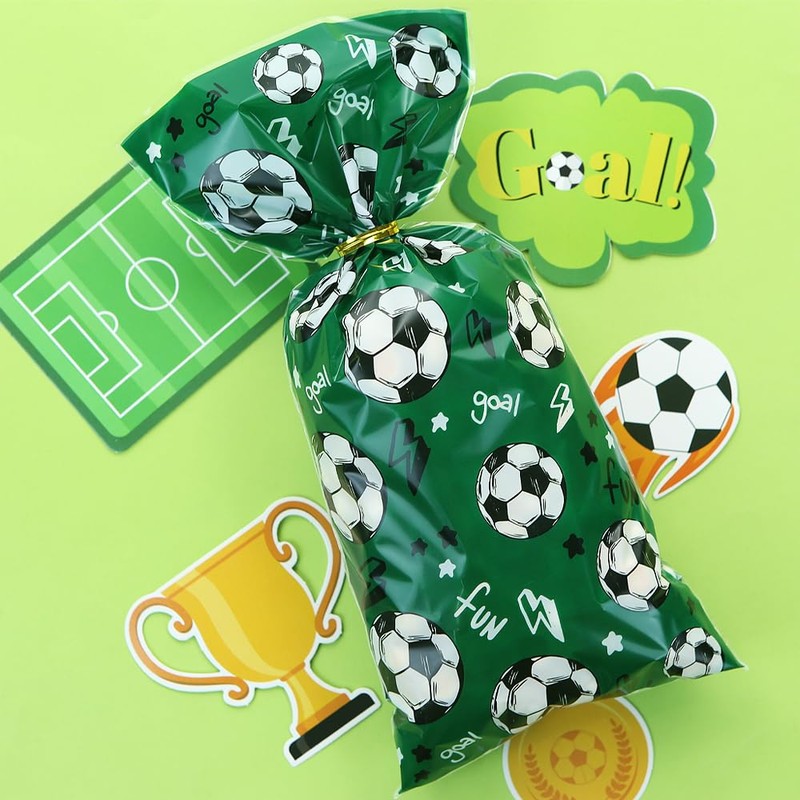 - ⚽【Great Value Pack】: Each pack includes 100pcs Football Treat Bags, which size are 12.5 x 27.5cm / 4.9 x 10.8 inches. Also contains 100pcs Gold Twist Ties: 9.5cm in length to seal off your sweets bags. Plenty of cello bags for you during the birthday favors. It is a very beautiful and practical gift for your team or friends.