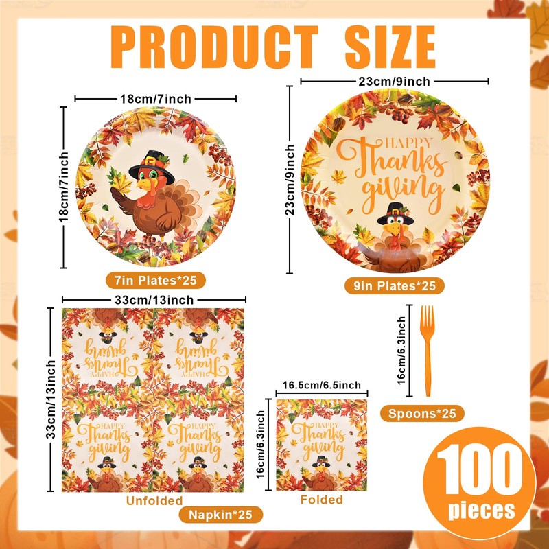 - Comprehensive Party Pack –This set includes 25 paper plates (7 inches) for desserts or sides, 25 paper plates (9 inches) for main courses, 25 matching napkins, and 25 plastic forks. With a total of 100 pieces, it has everything you need to serve a complete Thanksgiving feast for up to 25 guests.