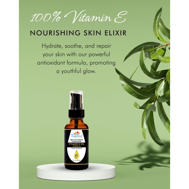 Tropical Holistic Vitamin E Oil, 100% Pure Max Strength 75,000 IU Vitamin E, Antioxidant Rich Skincare Oil for Face, Hair, Body & Nails, 2 oz
