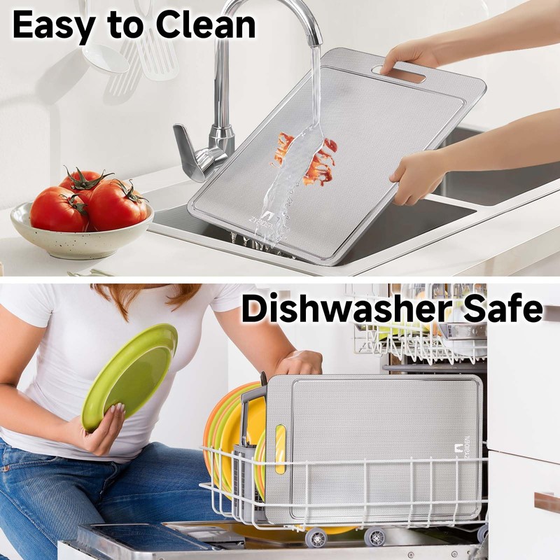- [2025 New Upgraded Scratch Resistant Design] Our cutting board is made of 100% titanium material, which is a lightweight material that won't attract odors. Compared with a traditional bamboo wooden chopping board, it will not crack or mold. And versus the plastic chopping board, it will not produce plastic debris. It is the first choice for a new healthy kitchen.