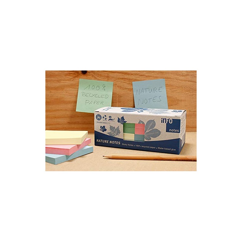 - Extra wide adhesive trace 25 mm for longer hold. Stick securely, remove and stick again without leaving any residue. Environmentally consciously manufactured and Blue Angel certified, 100% recycled paper, solvent-free, odourless adhesive and plastic-free packaging. Comfortable pack of 12 blocks
