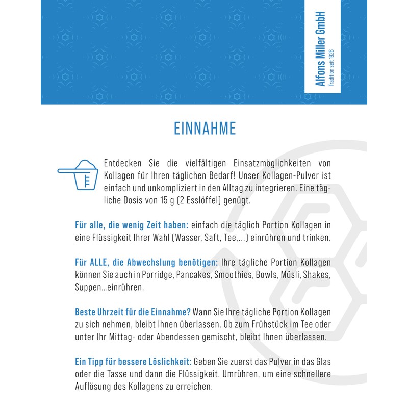 - GESCHMACKSNEUTRAL / PRAKTISCHE ANWENDUNG: Wir empfehlen täglich 15 g Kollagenhydrolysat Pulver (Collagen Powder). Unser Collagen Pulver ist fein, wasserlöslich, geruchslos und löst sich schnell in Wasser, Saft, Tee, Shakes, Soßen, Suppen & Smoothies auf.