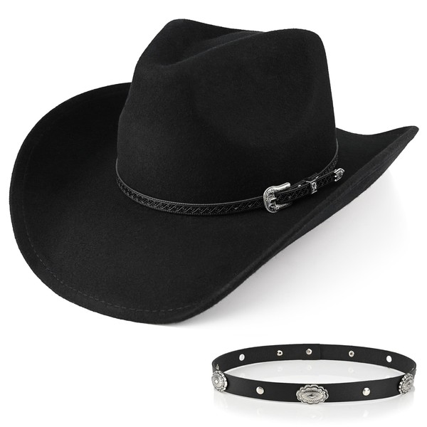 100% Wool Men's Women's Western Cowboy Hat Classic Black Cowgirls Hats Fedora Hat Felt with Two Decorative Bands (US, Alpha, Medium, X-Large, Black-B)