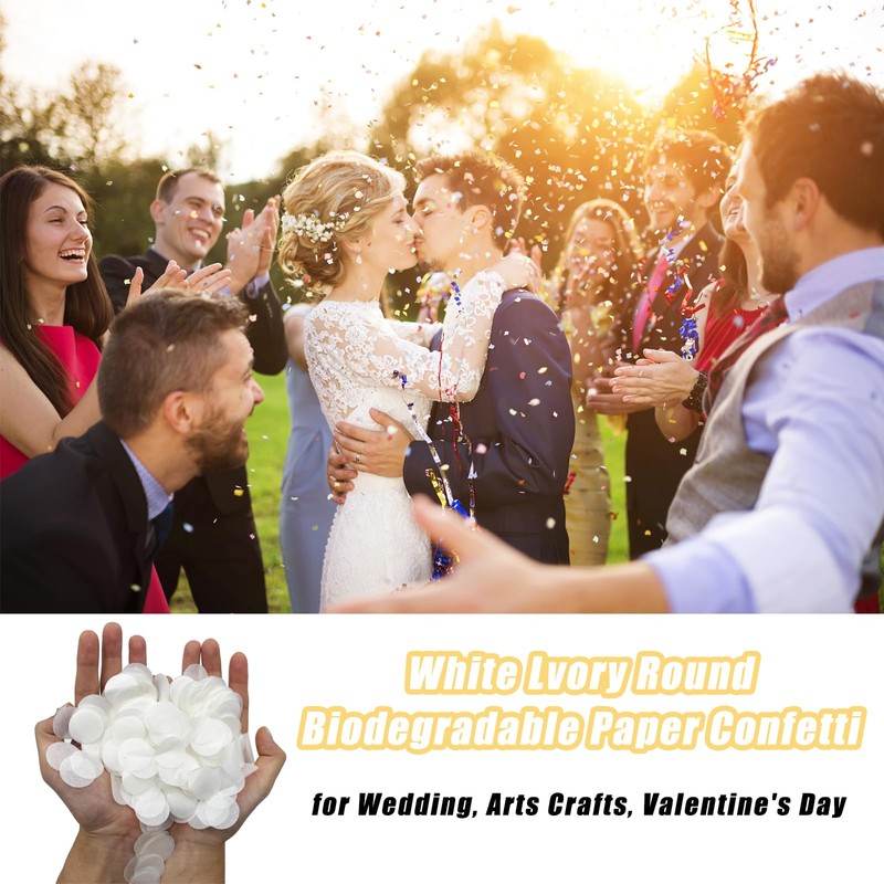 - 1. Product Content: This pack contains 10,000 pieces of white biodegradable confetti in a classic round shape. Perfect for weddings, parties, and celebrations, each piece is lightweight yet durable, ensuring a beautiful scattered effect. The white confetti is made from eco-friendly materials, making it safe for indoor and outdoor use