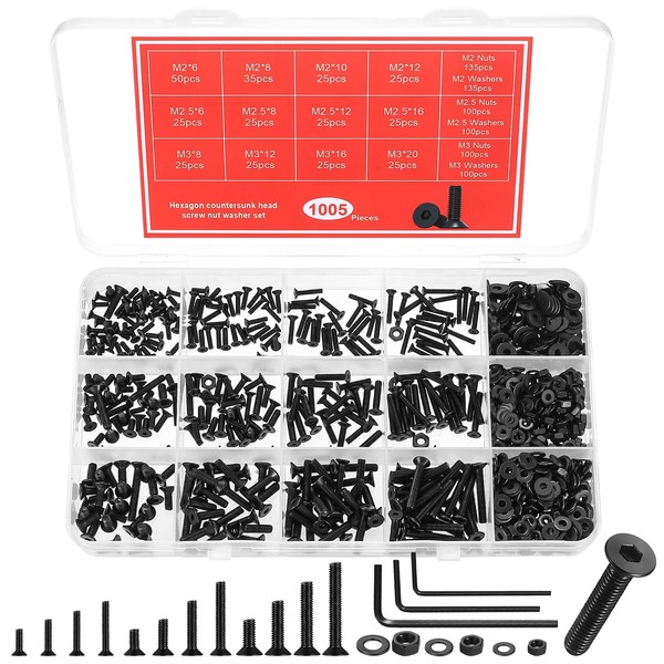 1005 Pcs Small M2 M2.5 M3 Countersunk Bolts and Nuts Set, Flat Head Hex Socket Head Screws Set, Machine Screws Nuts and Washers, Black Assorted Bolts Assortment Kit