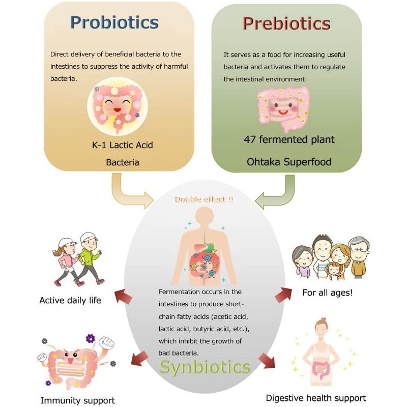 - PREBIOTICS+ PROBIOTICS = SYNBIOTICS : A perfect match of 100 Billion cfu K-1 Lactic acid bacteria and traditional Ohtaka Superfood Prebiotics in one!