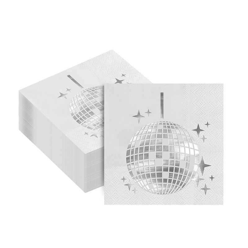 100Count Party Napkins, Beverage &Cocktail Napkins,Personal Napkins,Disposable Napkins,Decorative Paper Napkins,Disco Napkin,Bulk,2-Ply, 5x5 inch,silver Foil,Disco ball, white silver