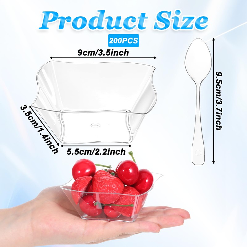 - Single Serving: Each 5 oz dessert cups (3.5x2.2x1.4 inches) is perfect for desserts, fruits, nuts, yogurt or appetizers. The included spoon (3.7 inches) is convenient to use.