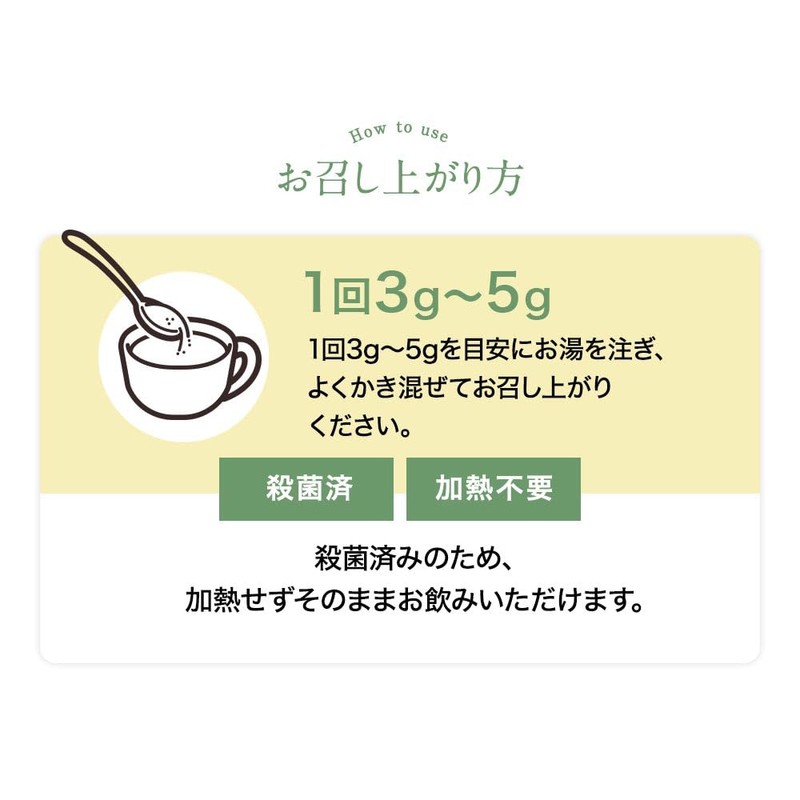 • 【原材料】乾燥ヨモギ(国内製造)【保存方法】直射日光、高温多湿を避けて保存してください。【賞味期限】別途商品ラベルに記載【栄養成分表示】100g当たり(推定値):熱量311 kcal / たんぱく質 11.9g / 脂質 2.7g / 炭水化物 72.7g / 食塩相当量 0.01g【その他】※開封後は賞味期限にかかわらずお早めにお召し上がりください。※本品製造工場では、大豆、やまいも、ももを含む製品を生産しています。【お召し上がり方】・1回3g~5gを目安に、お湯を注ぎ、よくかき混ぜてお召し上がりください。(溶けにくさやダマが気になる際は、シェイカーの利用をおすすめいたします)・牛乳や豆乳に混ぜても美味しくいただけます。【生産国】日本【摂取上の注意】妊娠・授乳中の方は医師にご相談の上お召し上がりください。