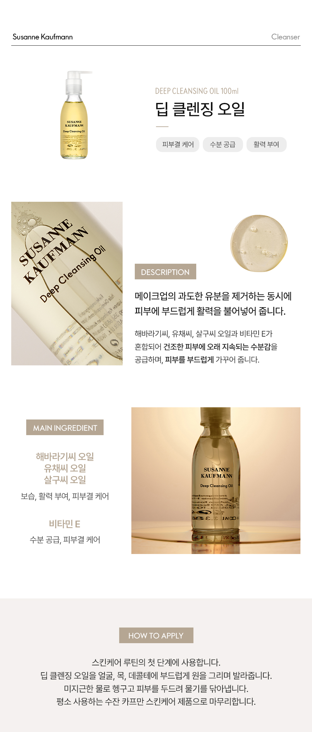 | 사용방법 | 스킨케어 루틴의 첫 단계에 사용합니다. 딥 클렌징 오일을 얼굴, 목, 데콜테에 부드럽게 원을 그리며 발라줍니다. 미지근한 물로 헹구고 피부를 두드려 물기를 닦아냅니다. 평소 사용하는 수잔 카프만 스킨케어 제품으로 마무리합니다. |