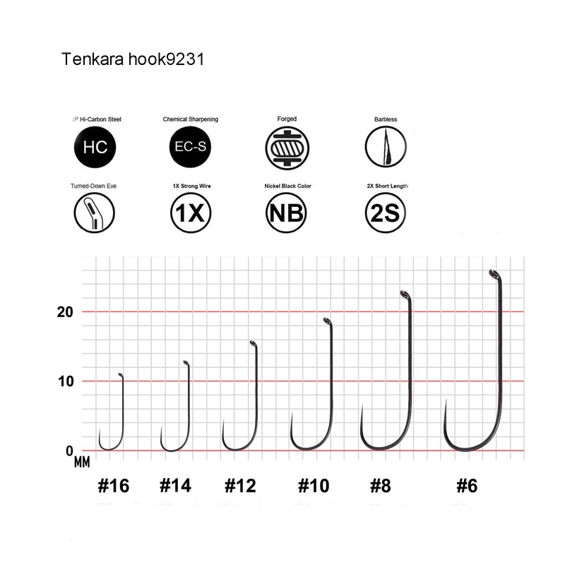 MORE INFO: 1.Tenkara hook9214: Dry fly hook down eye, standard fine, wide gape, forged, sizes 10# to16#.