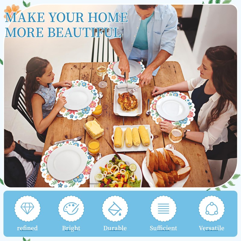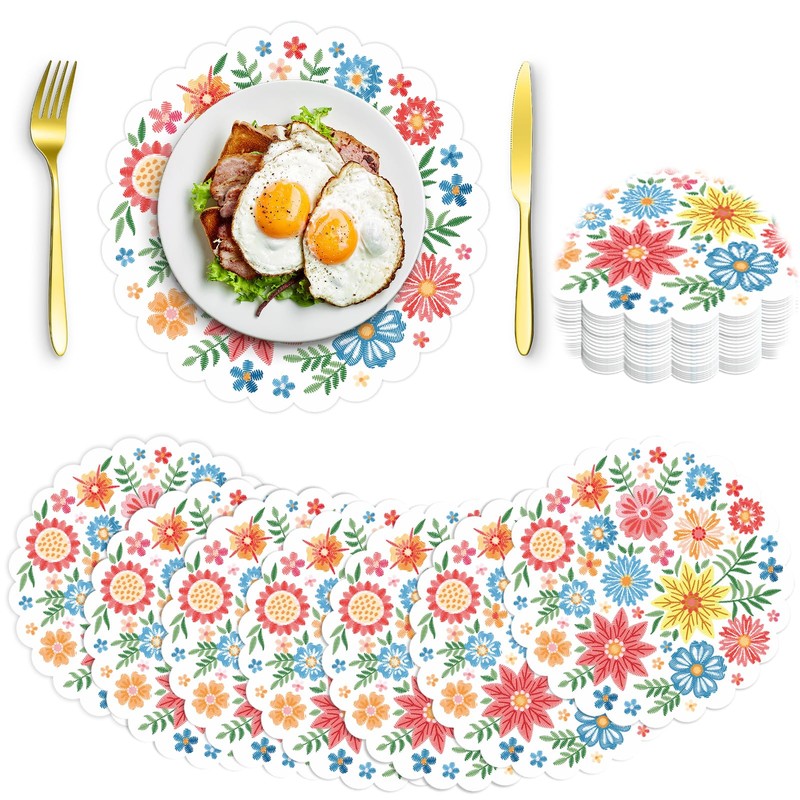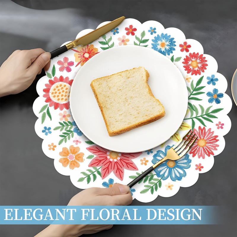 100pcs 13.5" x 13.5" Round Disposable Floral Place Mats – Embroidered Spring Design Embroidered Flowers Place Mat for Summer Table Setting