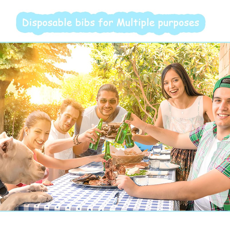 - Easy to Wear Bib: This adult bibs for men is light and comfortable, just need to wear the final pocket from the head can stop the juice and oil stain the clothing during the meal, the bibs for adults with disposable gloves can enjoy a seafood boil party, or exercise independent eating people can also use this plastic bibs
