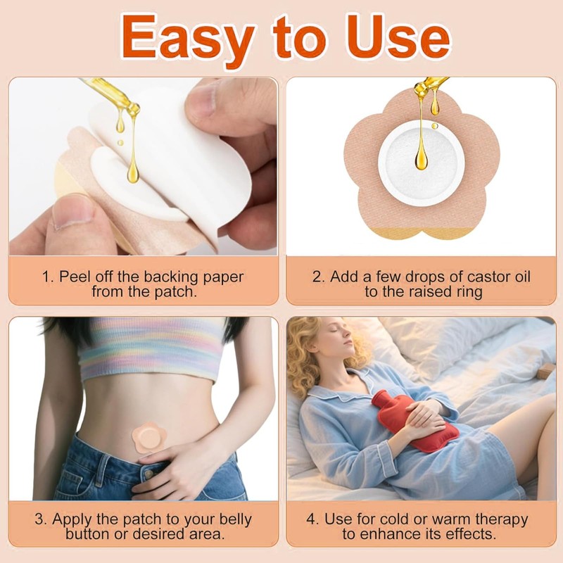 - Easy to use: Very easy and fast. Simply peel off the paper and apply 3-5 drops of your own castor oil (or other essential oil) to the center of the cotton pad. Let it sit for 1-2 minutes until it has completely absorbed the oil. Then apply it to a clean, dry navel or target area.