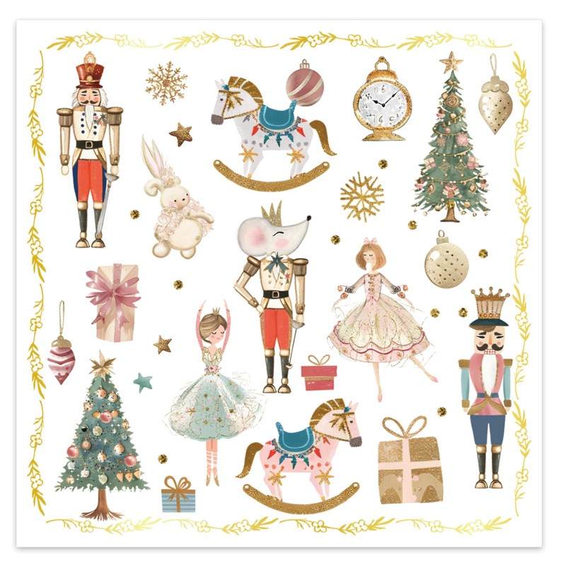 - Nutcracker Watercolor Designs: Each napkin features watercolor nutcracker motifs, including dapper nutcracker soldiers, rat, graceful ballerinas, lush Christmas trees, rocking horses, and wrapped gift boxes. Perfect for elevating Christmas dinner tables, where the intricate designs spark conversation, or tea parties.