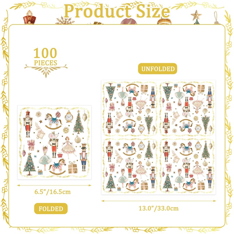 100Pcs Christmas Paper Napkins Nutcracker Disposable 2-Ply Napkins with Ballerinas, Christmas Trees, Horses Design for Bathroom, Xmas Dinners, Holiday Parties, Table Decor 6.5x6.5 Inch