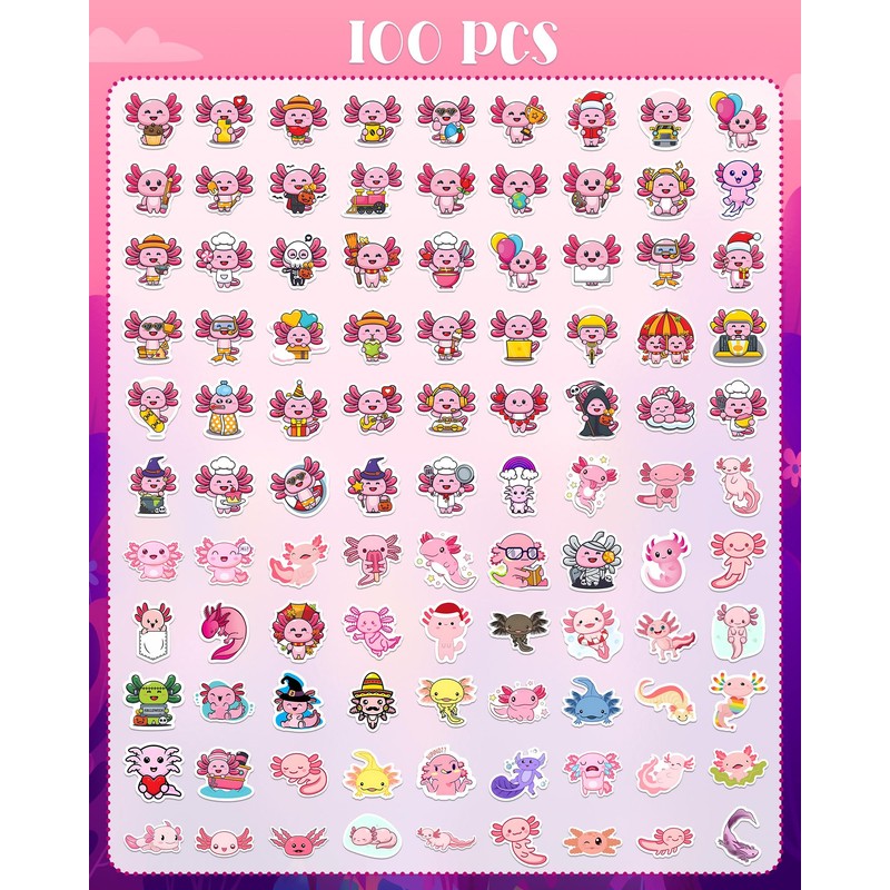 - Variety of Designs: Each pack includes 100 unique and vibrant axolotl-themed stickers, ensuring you have plenty of options to choose from Whether you’re decorating your planner, personalizing your laptop, or adding flair to your water bottle, there’s a design for every occasion