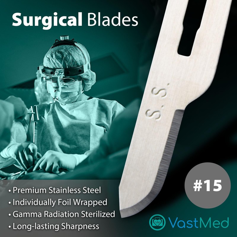 100PCs Dental Grade #15 Stainless Steel Sterile Surgical Blades by VASTMED | Individually Wrapped High Stainless Steel Dermablade Surgical Blade
