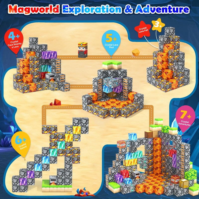 - 【UNLEASH THE MAGIC OF CRYSTAL CAVE】 Dive into the NEW Crystal Cave Magnetic Blocks Set and expand your MAGWORLD universe! Unearth glowing crystals near a fiery volcano, conquer building challenges, and spark epic adventures. Ready to craft your own magnetic masterpiece? Let the quest begin!