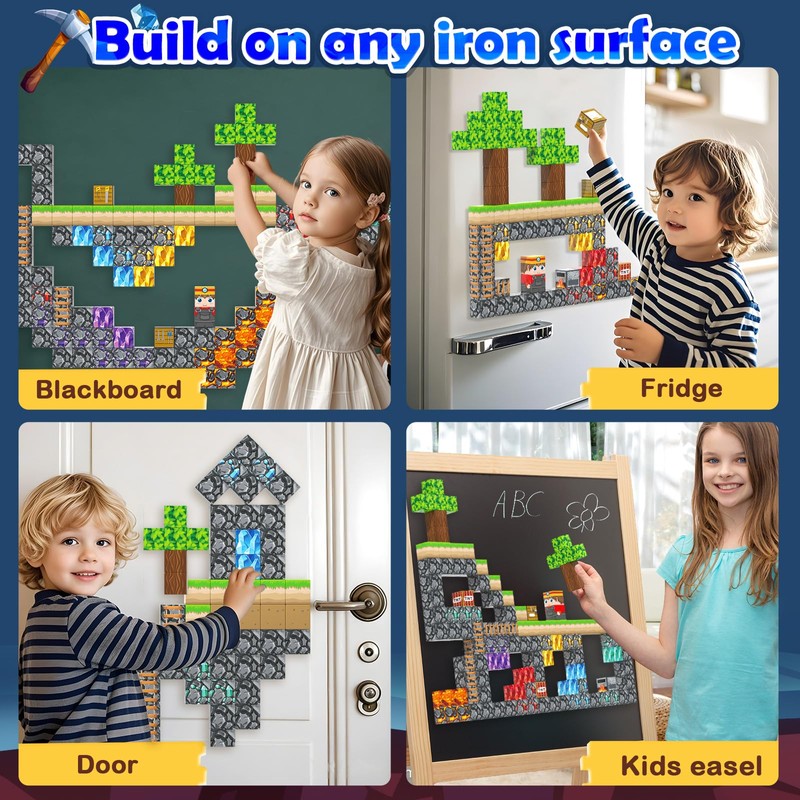 - 【MAGNETIC PLAY ON ANY IRON SURFACE】 Turn the little fans into REAL-LIFE architects! Kids not only can create 3D building crafts, but also can stick magnetic blocks onto fridges, whiteboards/blackboards, steel doors … even build sideways on easels, for fantastic 2D creations! Unlock endless possibilities! Toss the piece set into the included travel pouch, stay click-clack ready for road trips, flights, or Grandma’s house.