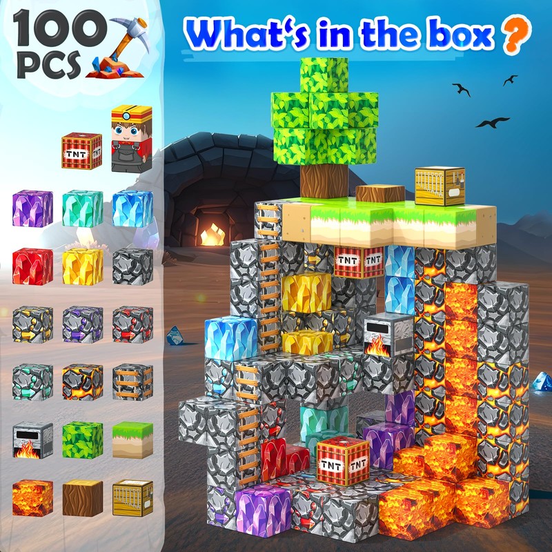 100PCS Magnetic Blocks Kids Magnet Toys Crystal Mine Cave Inspired Playset 1 inch Building Cubes Magworld Add-on Building Craft Sensory Toys Game Gifts for Ages 3-5 4-6 5-7 8-12