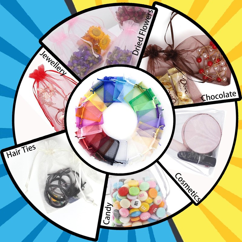 - Organza bags is perfect as gift decoration. You can used for wrapping jewellery, crystals, earrings, sweets, candy, chocolate, crafts, wedding confetti, soap, cosmetic samples, herbs, sachets, potpourri, dried flowers, flower plant seed etc.