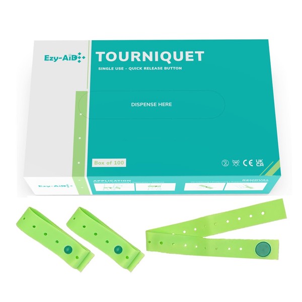 100pk Ezy-Aid Disposable Tourniquet with Button, quick release for safe one hand removal, smooth material, non-toxic, stretchable and strong