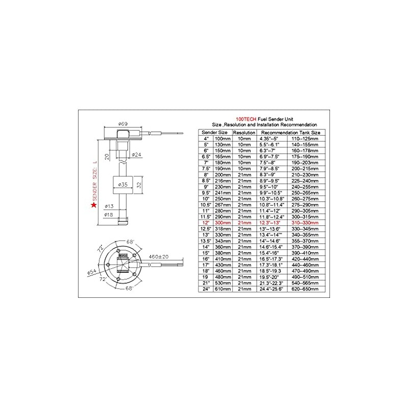 100TECH Stainless Steel Fule tank Sending Unit is Made With High quality Reed Switch. It's Easy to Install. A Perfect Match with All the Screw Holes Lining up the Unit Comes with 5pcs of Screws and 1pc of New Neoprene Gasket. It is the Direct Replacement for Arm Type Sensors or Original Wema Unit for Better Durability and Reliability.The Substantial Flange can Seal the Tank CompletelyThe 100TECH Marine Fule Sending Units are Widely Used in Marine, On-road, Off-road, Generator set, and Industrial Applications. The Electric Liquid Level Sending Unit Utilizes Reed Switch and Magnetic Field technology. In 100TECH Reed Switch Level Senders the Float is the Only Moving Part of the Sender, Thereby Minimizing Potential Mechanical Failures.Material:Body: SUS 316 Stainless Steel.Cable: PVC.Float: NBR.Mounting Methods: Standard SAE 5 hole pattern.Protection Rank: IP67.Output Signal: 0-90 ohms (0 ohm at empty , 90 ohms at full).Resolution Range:10mm:5,6,7,21mm: 8,9,10,11,12,13,14,16Operational Temperature: -40F ~ +85F (-40C ~ +85C).Package Information:1 x 100TECH Fuel Sending Unit 1 x Gasket 5 x M5*0.8 Length(16mm) Screws 1x Sending Unit Installation Guide Note: Please kindly pay Attention to the Product Description, Especially the Resolution and Length (the Length of Sender Should be 1" less than the Depth of the Tank if tank is Plastic,and 0.5" Less Than the Depth of the Tank if Tank is Metal) Before Placing the Order.