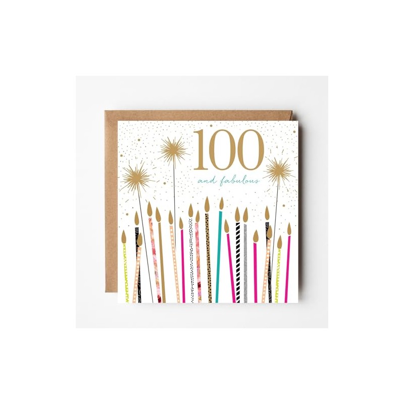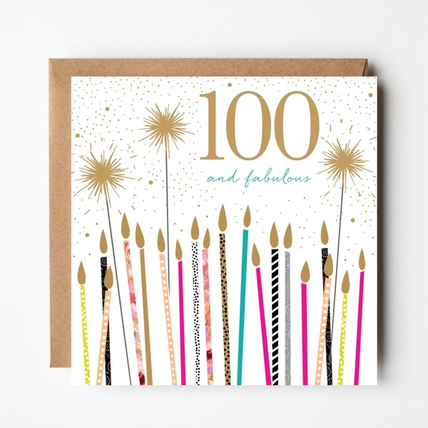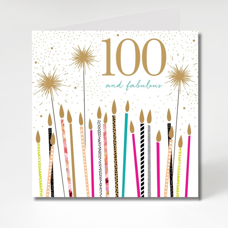 - 100th Birthday Card, Blank Inside,Contemporary Candles and Sparklers illustration with Gold detailing. Modern 10th Greeting Card. 100 and fabulous.