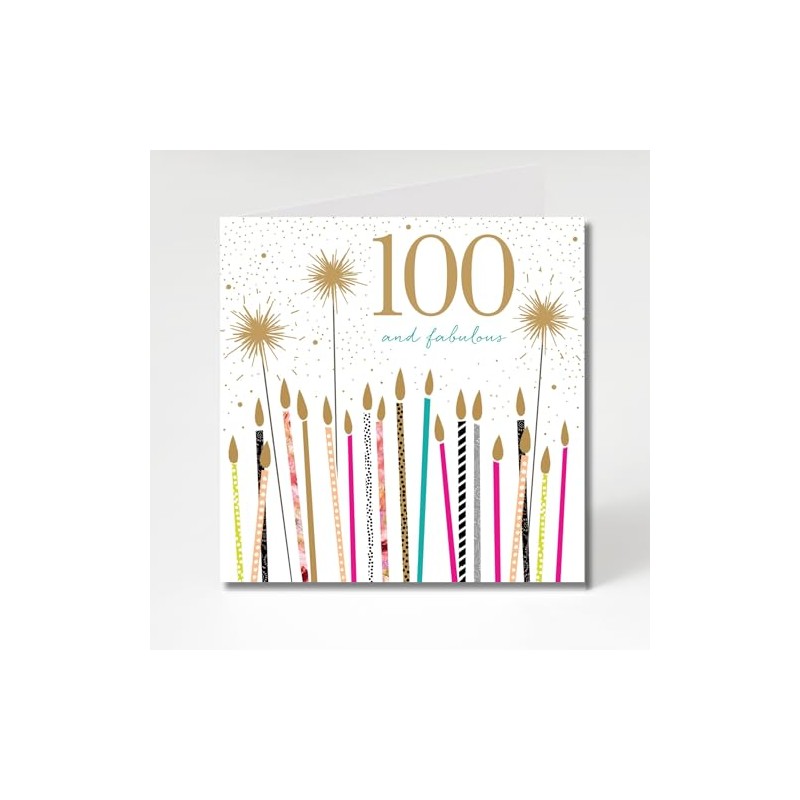 100th Birthday Card, Blank Inside,Contemporary Candles and Sparklers illustration with Gold detailing. Modern 10th Greeting Card. 100 and fabulous.