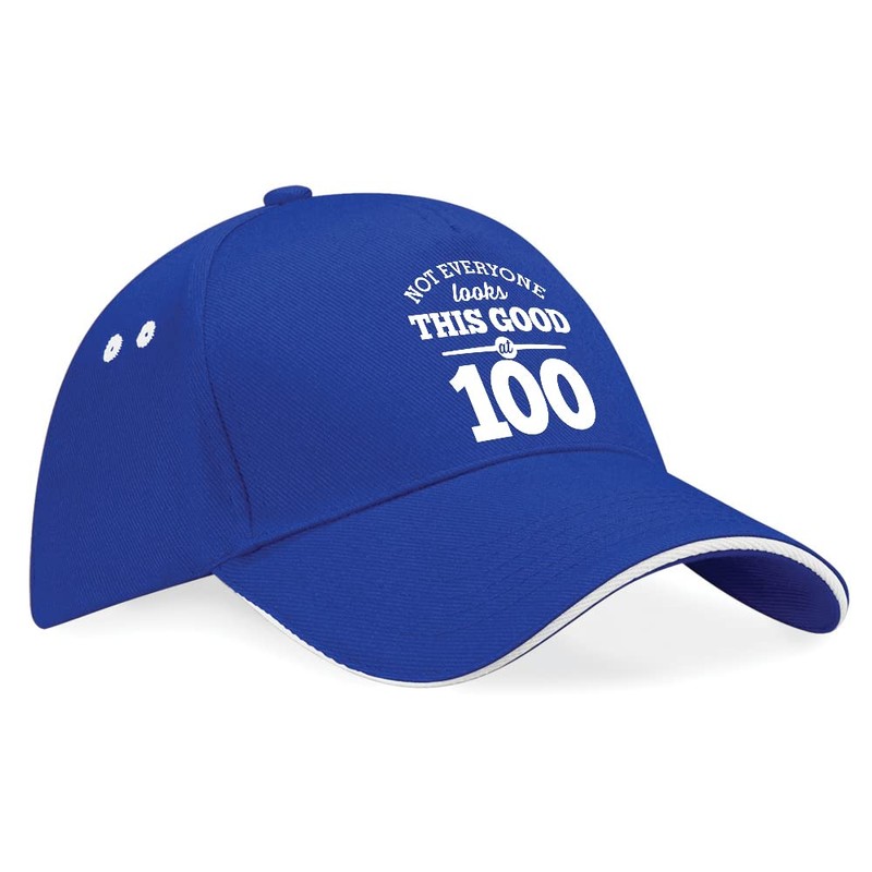 - Novelty 100th Hat: This baseball cap features a humorous slogan 'Not everyone looks this good at 100' printed in white, perfect for celebrating a 100th birthday milestone