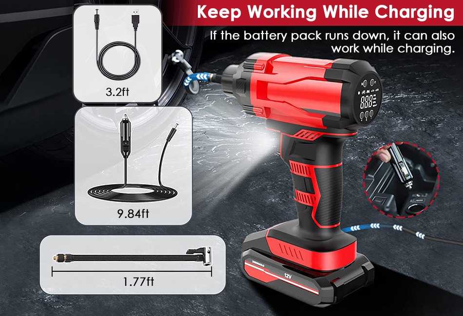 ≤100W Tire Inflator Air Compressor, 12V Cordless Car Tire Pump with Rechargeable