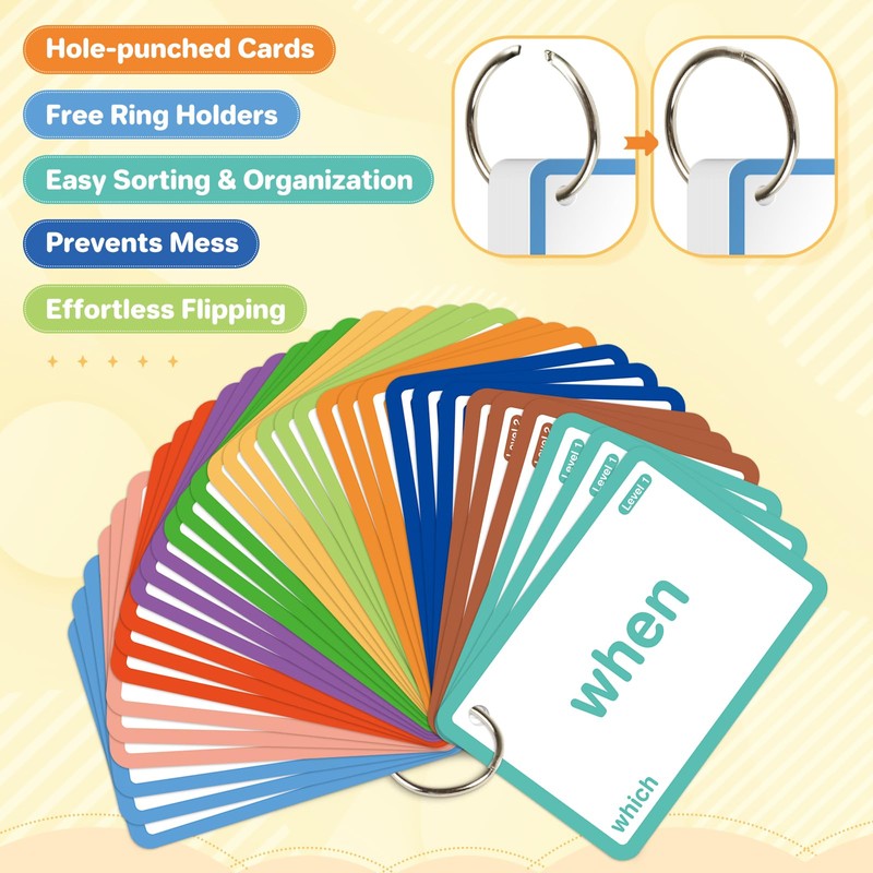 - SUITABLE SIZE & ELEGANT DESIGN:There are 11 different colors to distinguish each levels, will better for sorting and orienting and make teachers/ parents teach students/ kids learn words better. With the rounded edges design, is safer and convenient for kids to pick and learn. Printed fonts are according to textbooks standards, clear and bright, that will attract kids to read and spell. Each card measures 3.25'' x 4.75''.