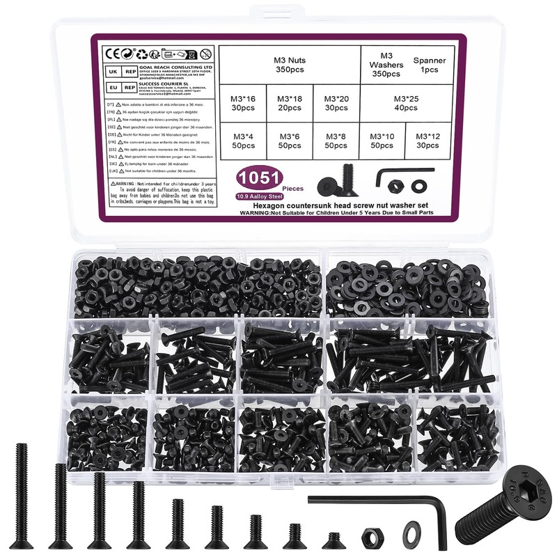 - Package includes: 1051 pieces in total, quantity and size include: 50 pieces M3 x 4 mm, 50 pieces M3 x 6 mm, 50 pieces M3 x 8 mm, 50 pieces m3 x 10 mm, 30 pieces m3 x 12 mm, 30 pieces m3 x 16 mm, 20 pieces m3 x 18 mm, 30 pieces m3 x 18 mm. 3x20mm, 40 pieces m3 x 25 mm, 350 pieces m3 nuts, 350 pieces m3 washers, 1 x wrench, suitable for daily use