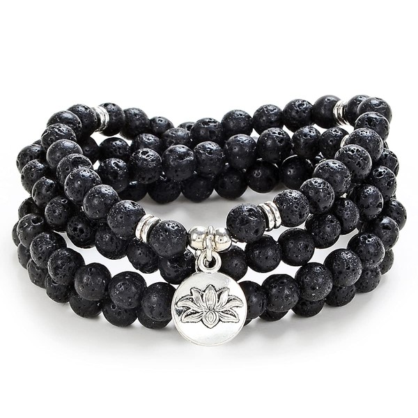 108 Bead Mala Bracelet with Lotus Charm and 6mm Small Stone Beads (Black Lava)