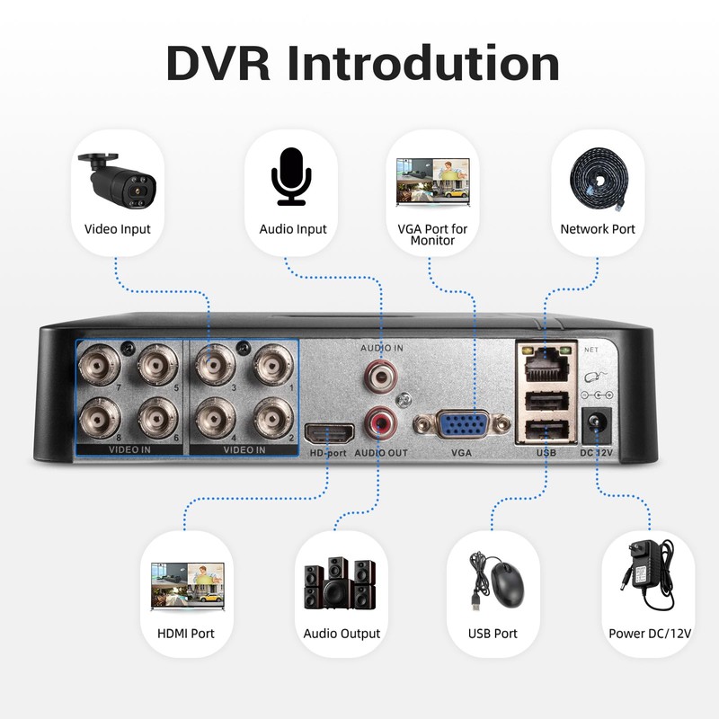 . Link the CCTV surveillance cameras to the DVR with BNC cables and then power on the whole system to start instant 24/7 recording, perfect for DIY lovers. .Connect the DVR to a TV or monitor with the HDMI or VGA output to get local live stream without limitation.