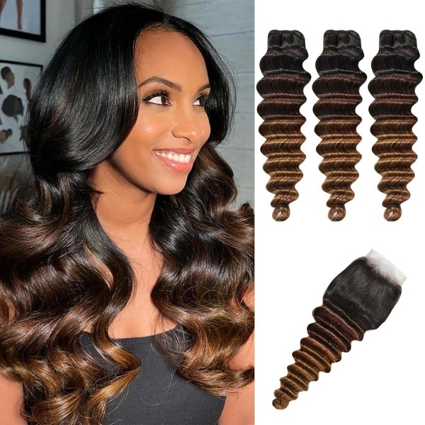 10A Bundles With Closure Loose deep Wave 16 18 20+16in, TB/2/30 Ombré Quick Weave Double Wefted Human Hair Bundles Unprocessed Brazilian Loose Wave with HD Lace Closure Free Part Pre plucked