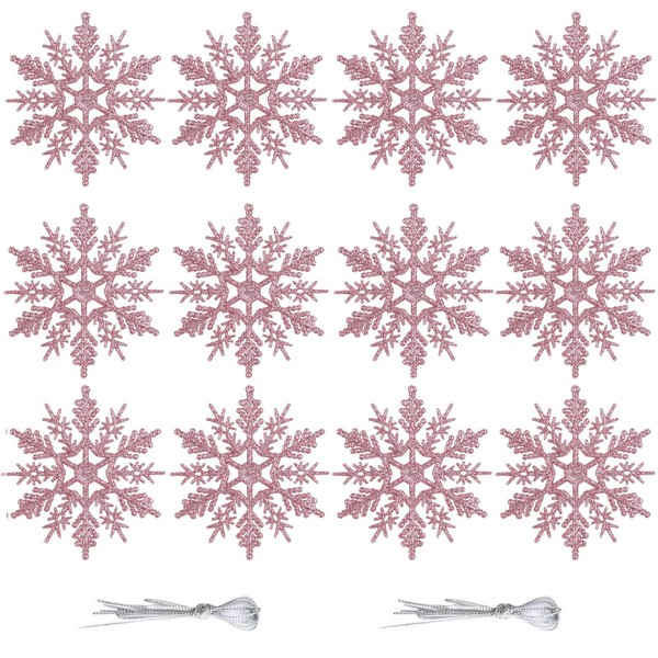 10CM Hanging Glitter Snowflake Decorations, 12 Pieces Snowflake Hanging Ornaments Glitter Snowflake for Christmas Tree, Xmas Home Décor, Christmas Party Supplies, Pink