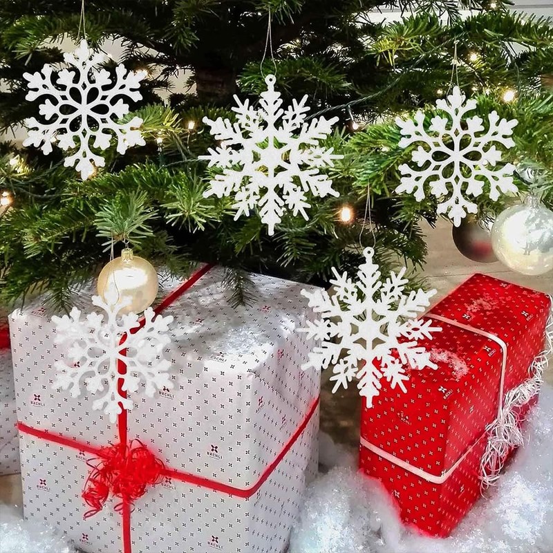 - Drenched in sparkling glitter for a shimmery look, these hanging Christmas snowflakes are a great addition to your indoor and outdoor party decor. They also add a perfect finishing touch to Christmas wreaths, garlands, ceilings, gifts and doorway decorations.