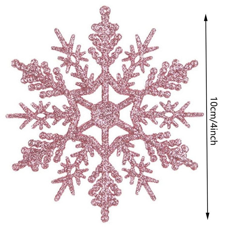 - Each snowflake is approximately 10cm wide and decorated with white glitter. Snowflake pieces is made of high quality plastic material, with glitter powders attached on the surface, nice glitter make it bright and sparkle.