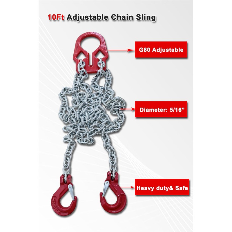- 【10Ft Adjustable Chain Sling 】 load capacity:6613 lbs, chain length 10’, diameter: 5/16”.G80 Adjustable Chain sling with safety hook 2 legs.