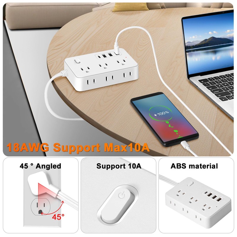- 10-in-1 USB-C Power Strip: Ultimate Charging Hub Meet your ultimate charging solution—the 10-in-1 USB-C Power Strip designed for modern multitasking. With 6 spacious AC outlets (3 wide-set to fit bulky adapters), 3 USB-A ports (5V/2.4A each), and 1 high-speed USB-C port , this hub effortlessly powers 10 devices simultaneously. Perfect for home offices, dorm rooms, or travel, it delivers max 1250W (125V, 10A) output and supports universal voltage (100V-250V) for global compatibility. No more outlet shortages—just seamless, organized power for all your gadgets.