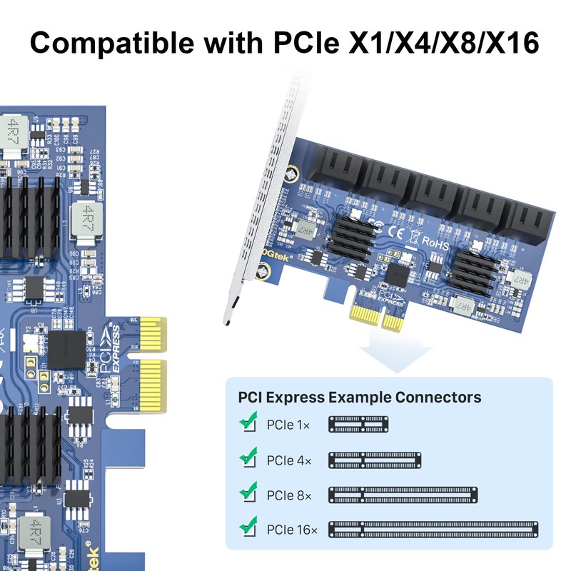 - Compliant with SATA3.0 standards, backward compatible with SATA1.0 and SATA2.0. Support PCIe1.0, 2.0, 3.0 protocol on motherboard PCIe X1, X2, X4, X8, X16 slot. PCIe 3.0 X1 interface provide 8Gbps total bandwidth, each SATA 3.0 port will get 6Gbps max speed for AHCI boot and storage.
