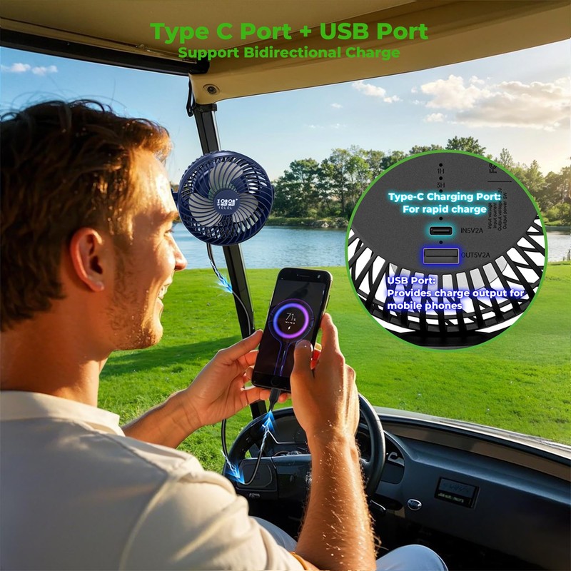 - Durable & Portable for Outdoor Use: This USB-powered fan includes a 5.9-foot cable for easy connection to your golf cart. Lightweight and durable, it’s perfect for golfing, camping, or any outdoor activity."